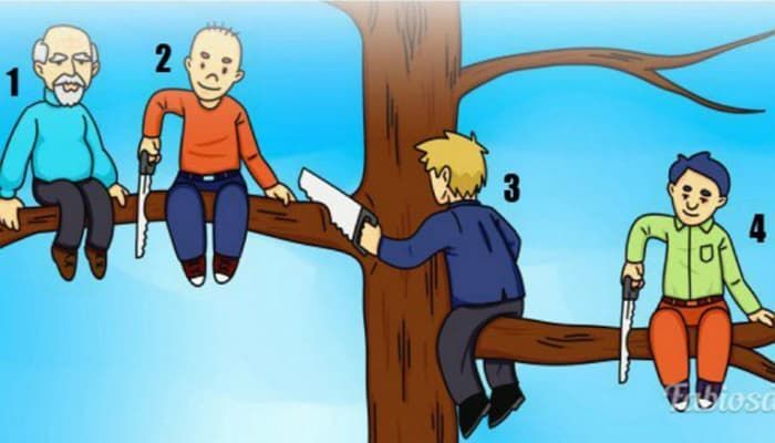 나뭇가지 위에 앉아서 서로 톱질을 하고 있는 사람들이 있습니다. 가장 왼쪽에는 나이 드신 어르신을 시작으로 오른쪽 끝에는 남색 머리를 하고 있는 남성이 앉아 있는데요.